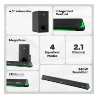 2.1 Channel: 4 x 2.25″ speakers with 240 Watt peak output 3D Surround Sound, DSP Enabled.