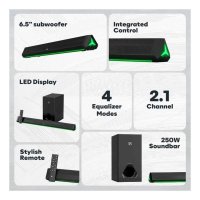 2.1 Channel : 4 x 2.25″ speakers with 250 Watt peak output 3D Surround Sound, DSP Enabled.