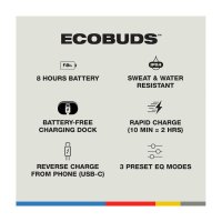 8 Hours Total Battery : When fully charged, EcoBuds gives you all-day listening with a 8 hours of playtime in the earbuds.