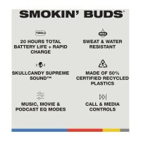 50% Renewable Plastic - Smokin’ Buds are made with up to 50% renewable plastics and every Skullcandy product uses 100% recyclable packaging. Renewable plastics are made from biobased or biodegradable materials and can be reused or recycled.